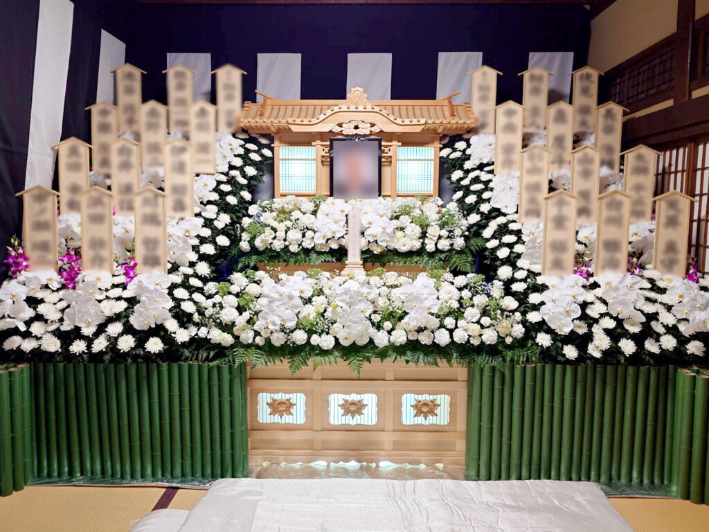 お葬儀シーンの生花祭壇および供花の設営に協力いたしました。